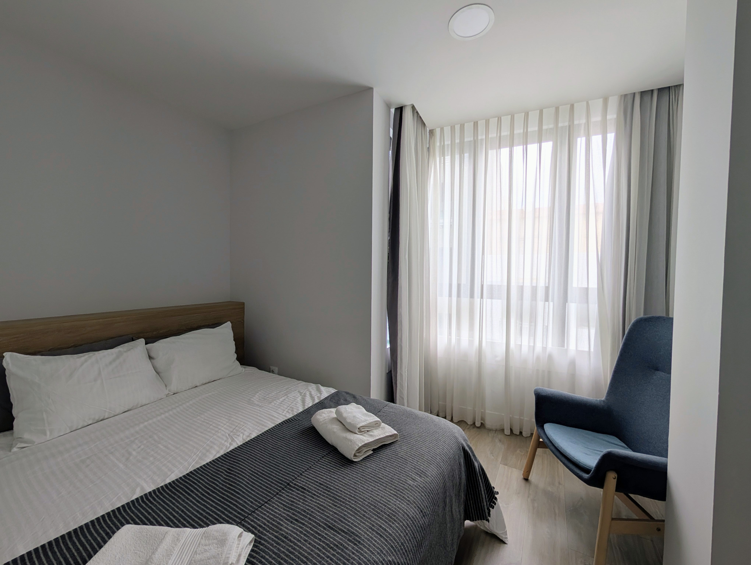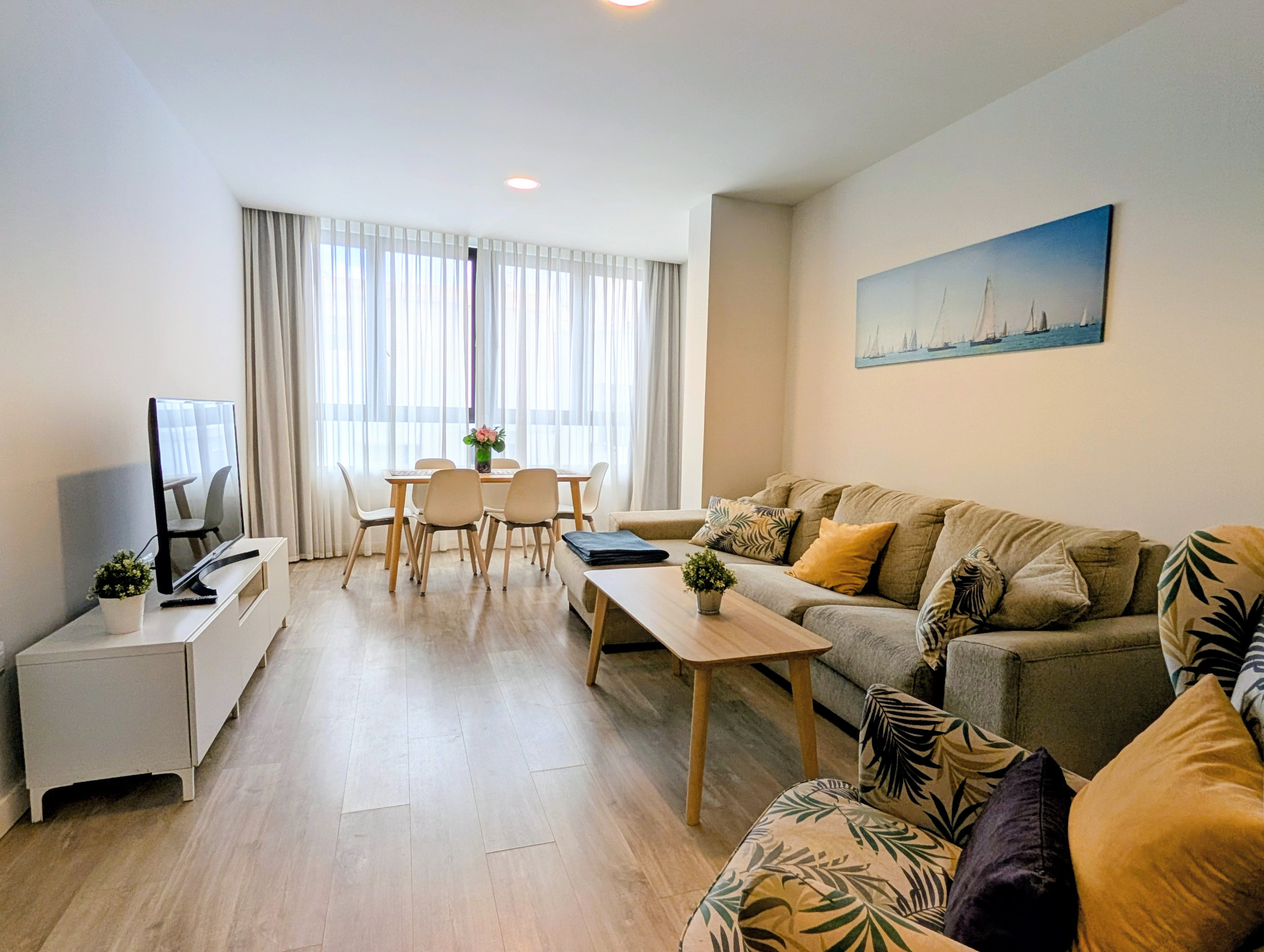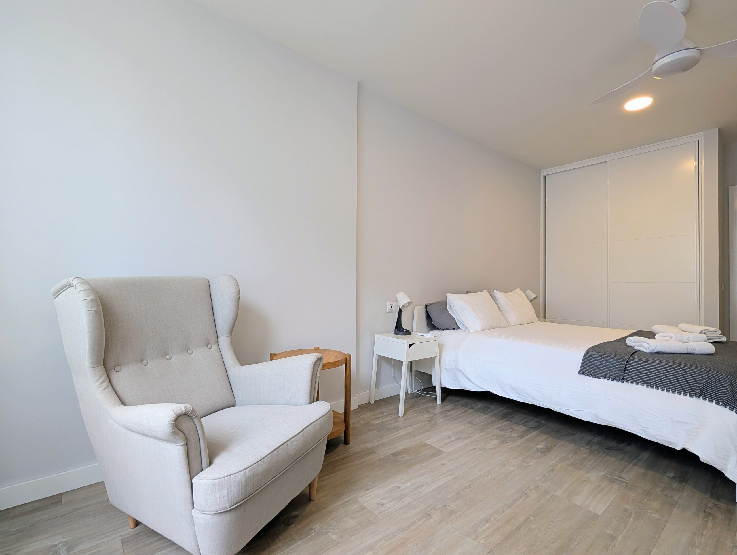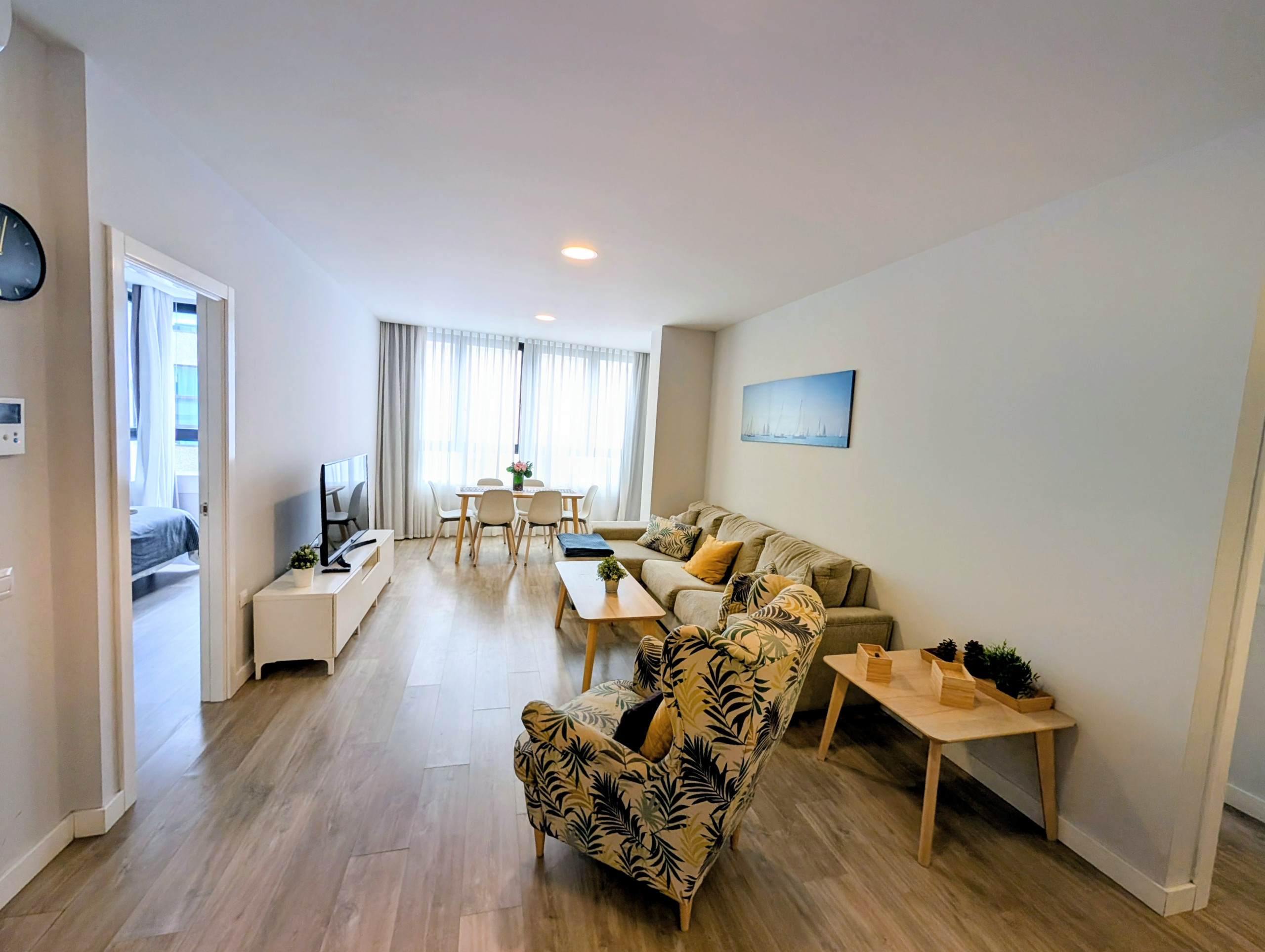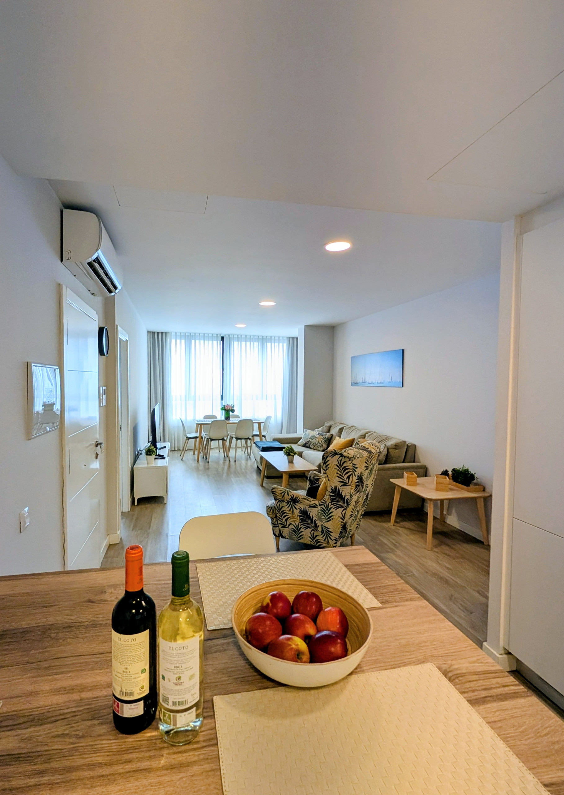 The apartment offers two spacious and bright double bedrooms, a full bathroom, and a fully equipped kitchen. The living room includes a dedicated workspace, a 50-inch HD TV, and fast Wi-Fi. Additionally, it has air conditioning, heating, ceiling fan, washer, and dryer. It also includes baby equipment including a crib, high chair, and baby bathtub.