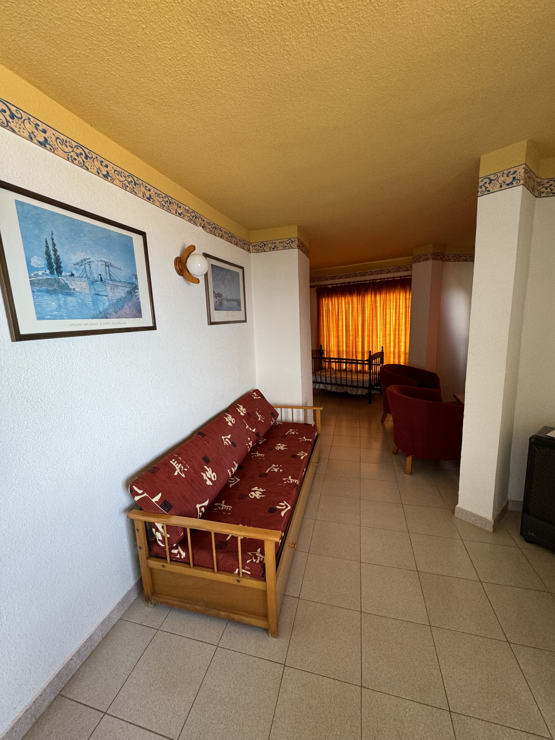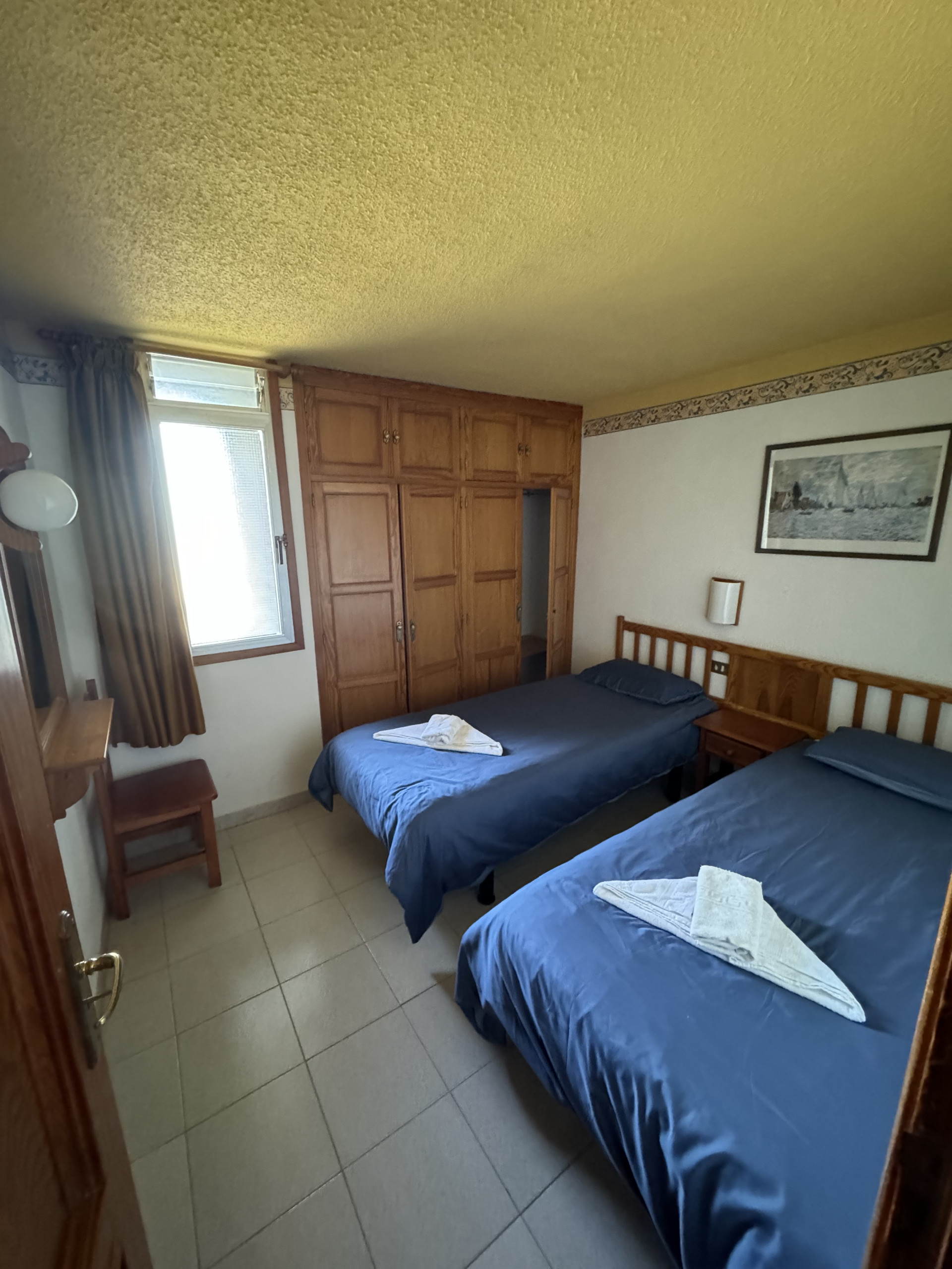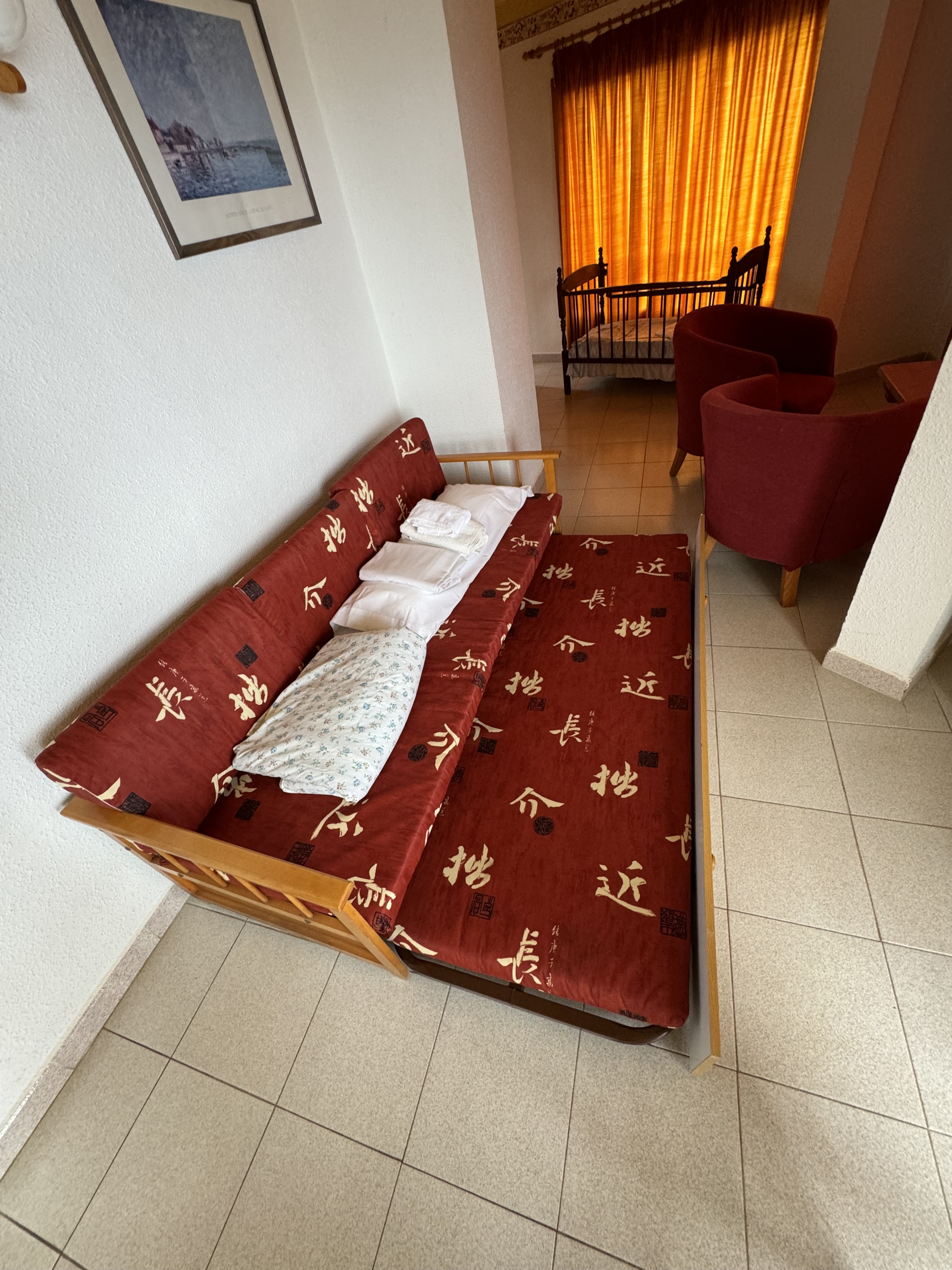 This apartment is located on level -2 of our building and features two bedrooms, each with two single beds, a sofa in the living room, a small fully equipped kitchen, and a private bathroom, all in a cozy and comfortable setting.