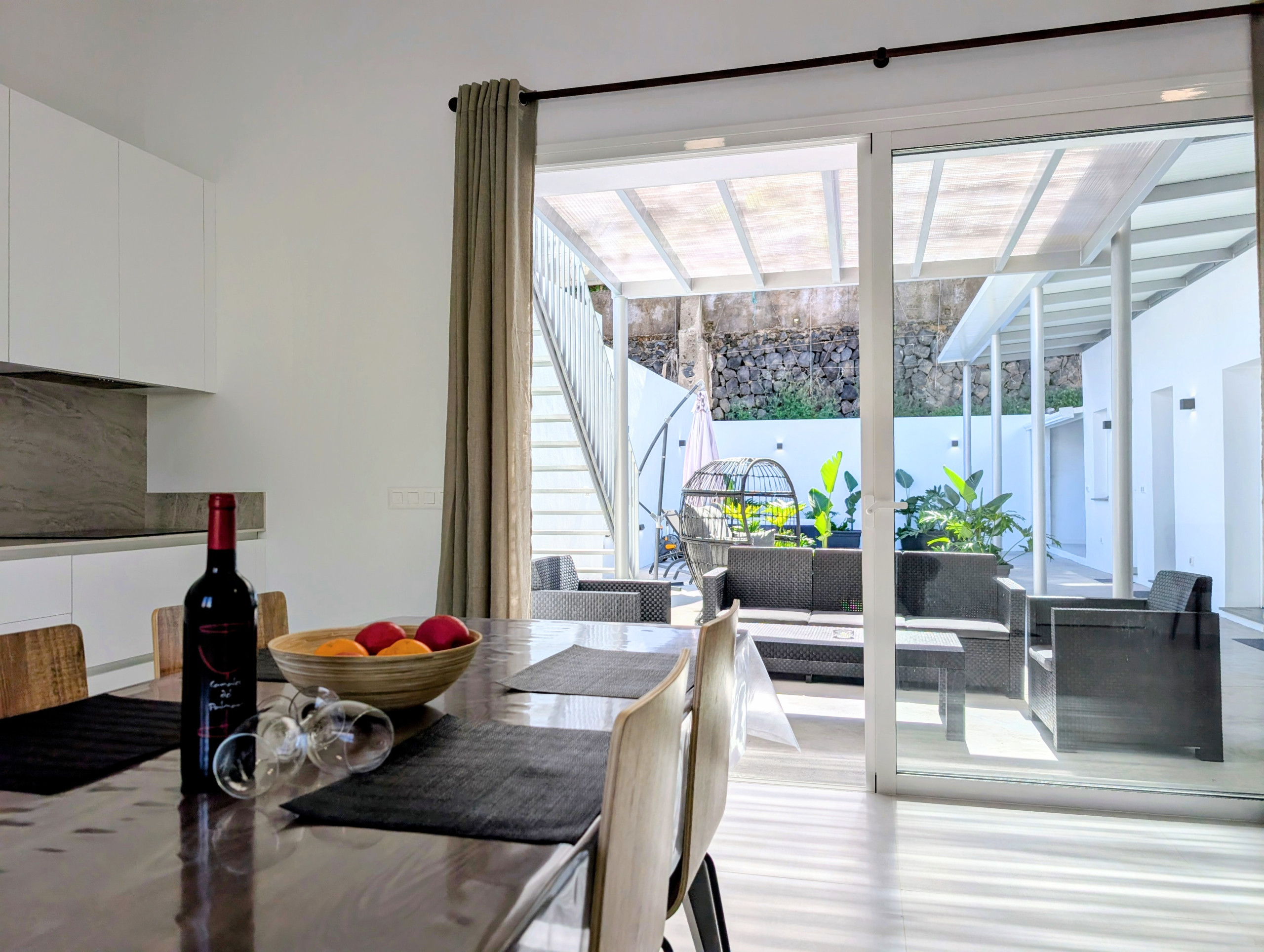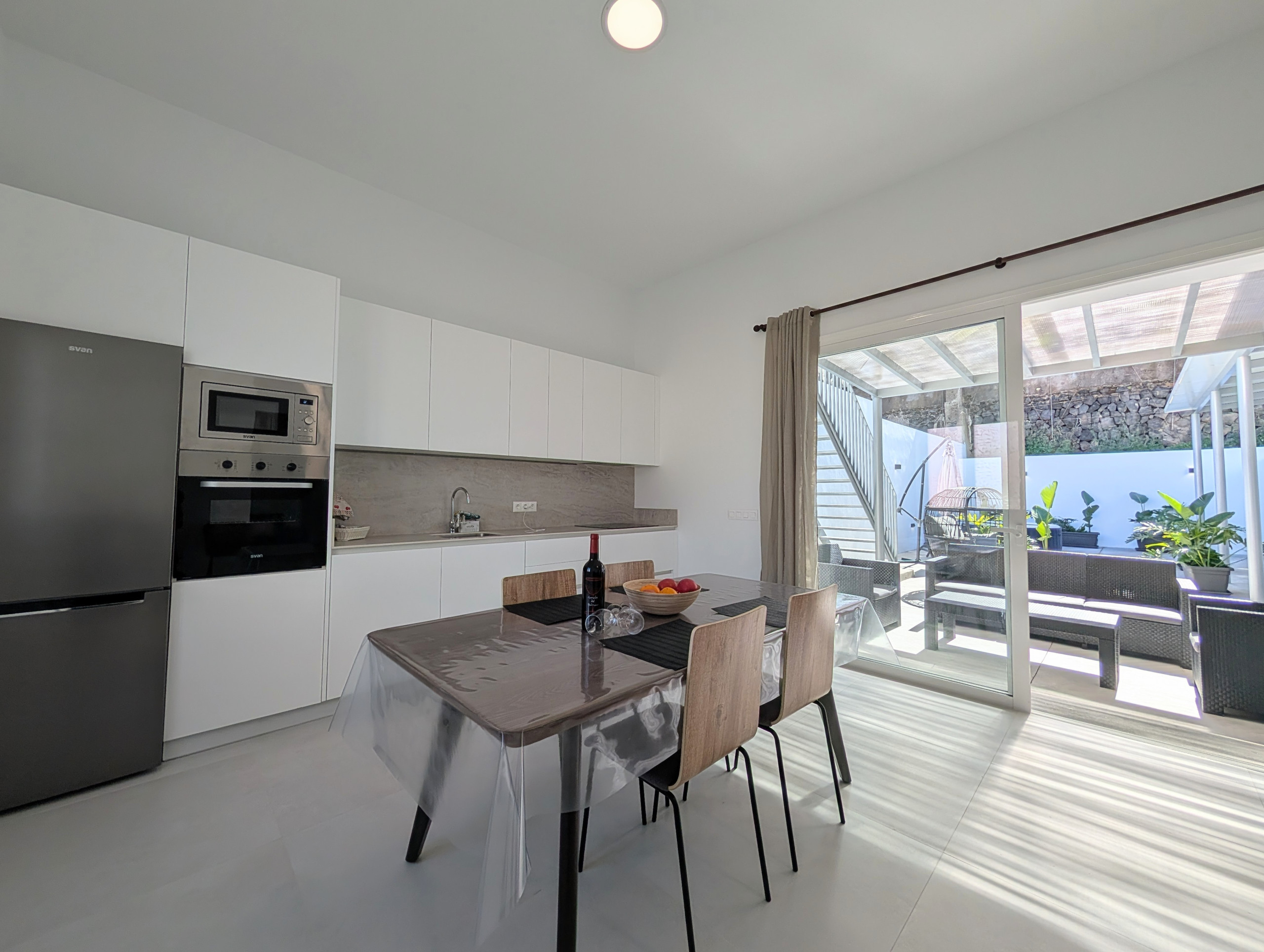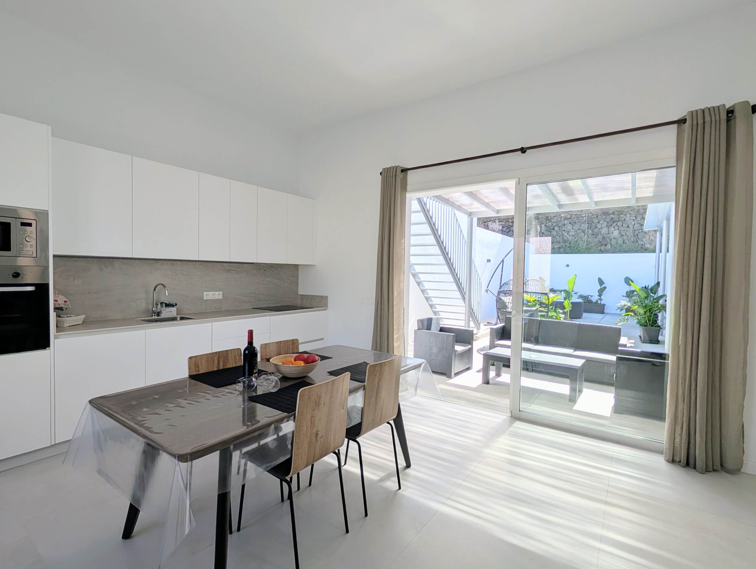 Spacious open-plan living area with lounge, dining space and fully equipped kitchen, all in one large high-ceiling room with direct terrace views