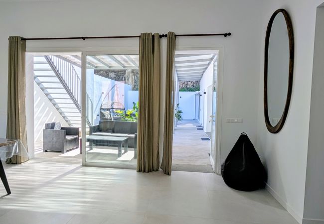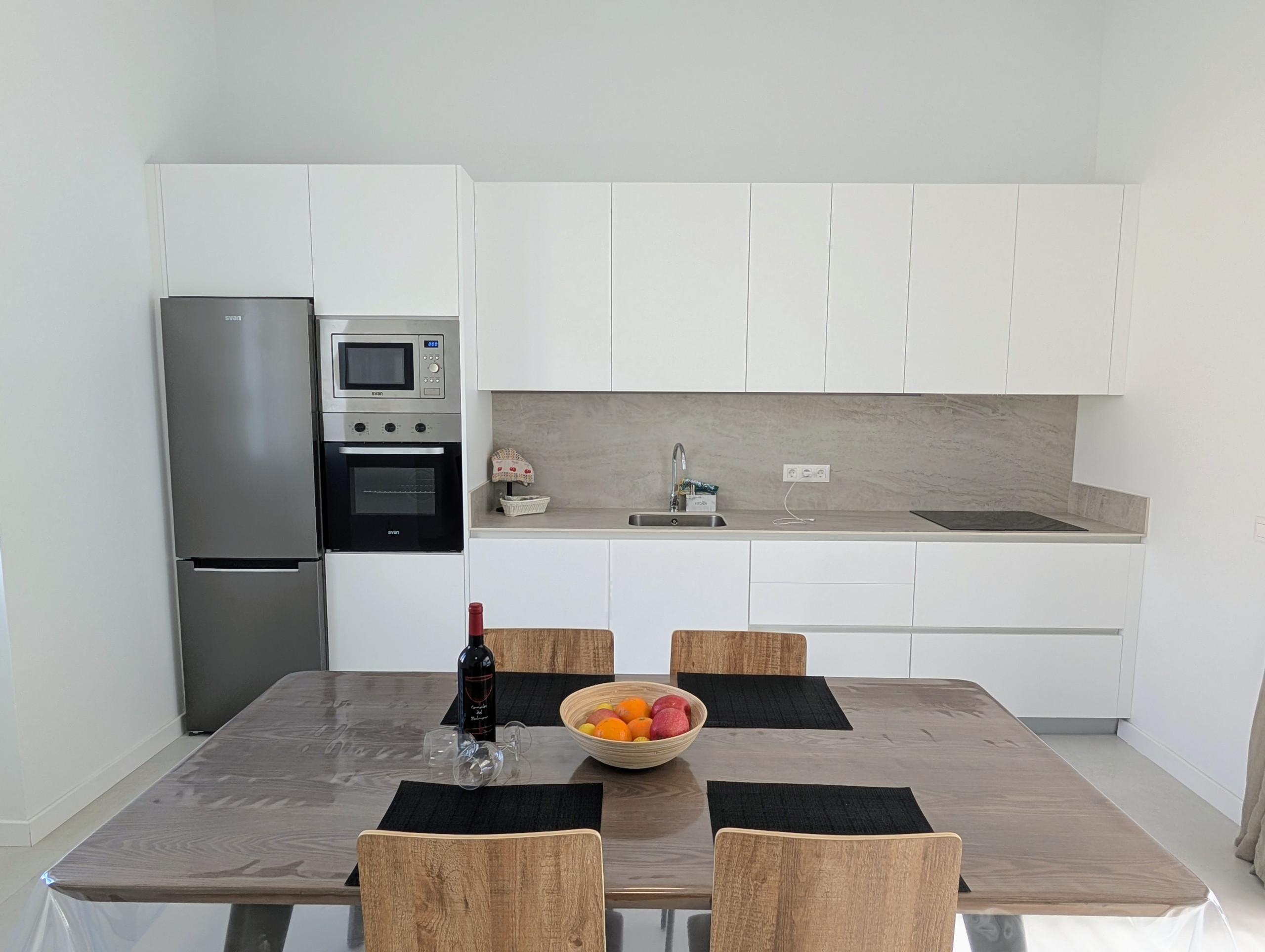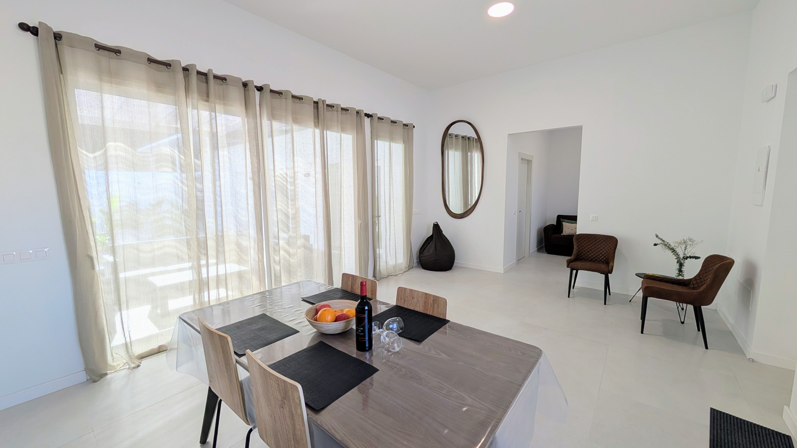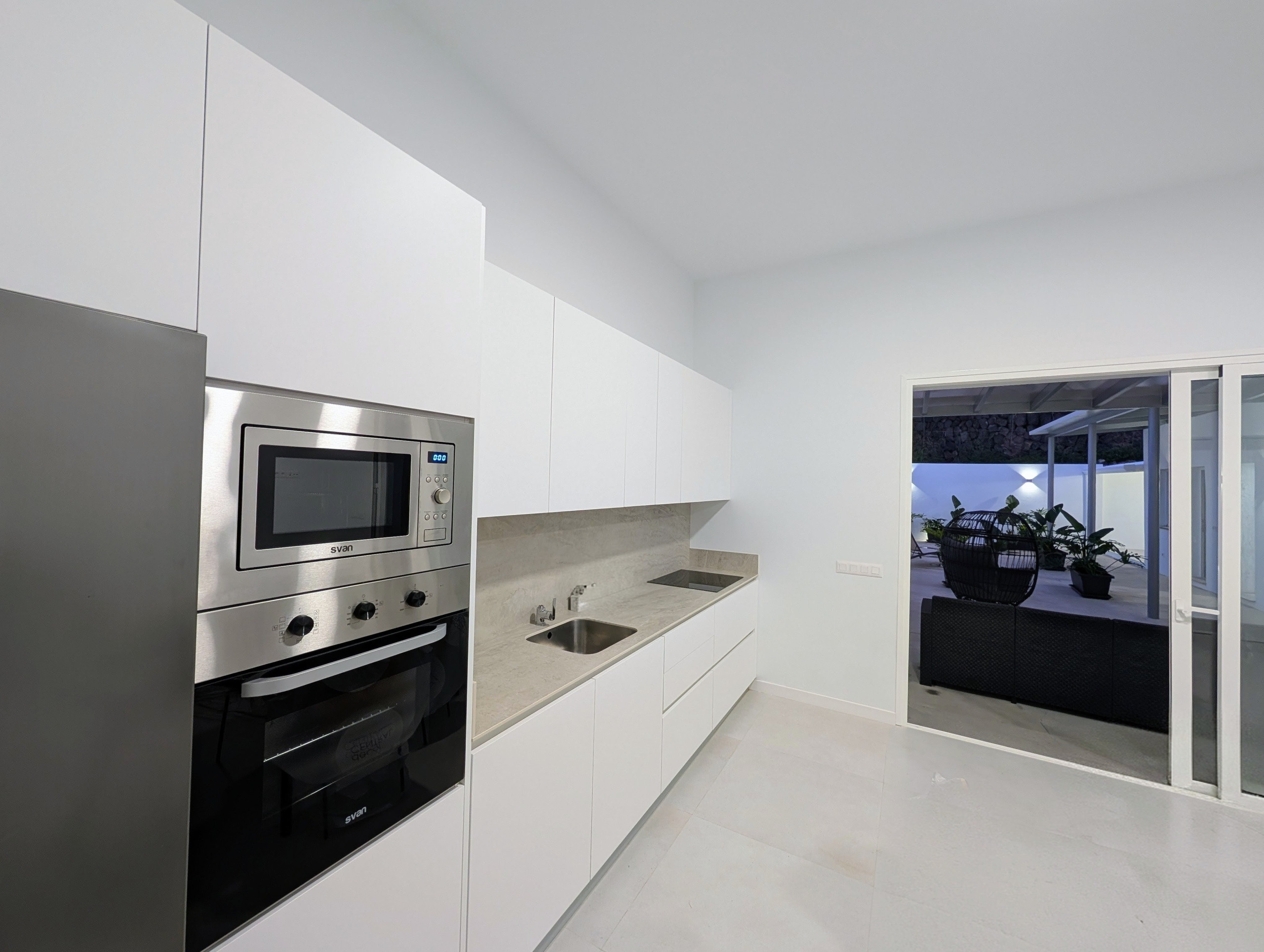 Spacious open-plan living area with lounge, dining space and fully equipped kitchen, all in one large high-ceiling room with direct terrace views